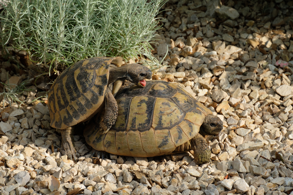 Спаривание сухопутных черепах. Самцам углубление на панцире нужно для того, чтобы взбираться на самку.