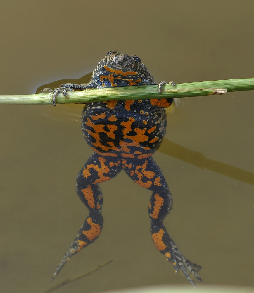• а вот гладкая нижняя часть туловища окрашена в красный или ярко-оранжевый цвет с черно-синими пятнами неправильной формы, причем этот рисунок у жерлянок никогда не повторяется. Двух совершенно одинаковых особей не существует.