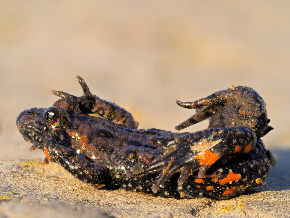 [su_note note_color=»#dff0d8″ text_color=»#010101″ radius=»10″ class=»su_my_success»]В случае опасности пятна на спине животных становятся ярче, что должно отпугивать врагов. Тело краснобрюхой покрыто слегка ядовитой слизью, которая, однако, не представляет опасности для человека.[/su_note]