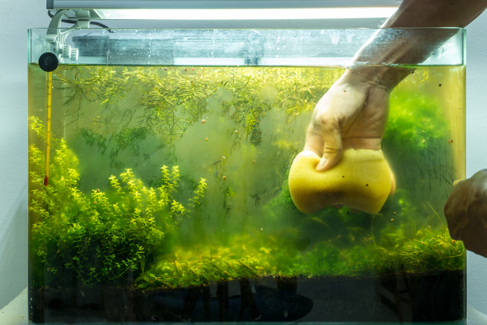 Сначала нужно очистить стенки аквариума. Для этого, не сливая воды, протрите их изнутри поролоновой губкой или скребком.