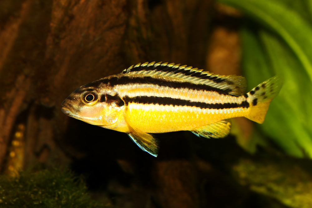 Меланохромис ауратус – яркий представитель малавийских драчливых цихлид. Чем он удобен, так это ярко выраженным половым диморфизмом – окрасы самки и самца противоположные: