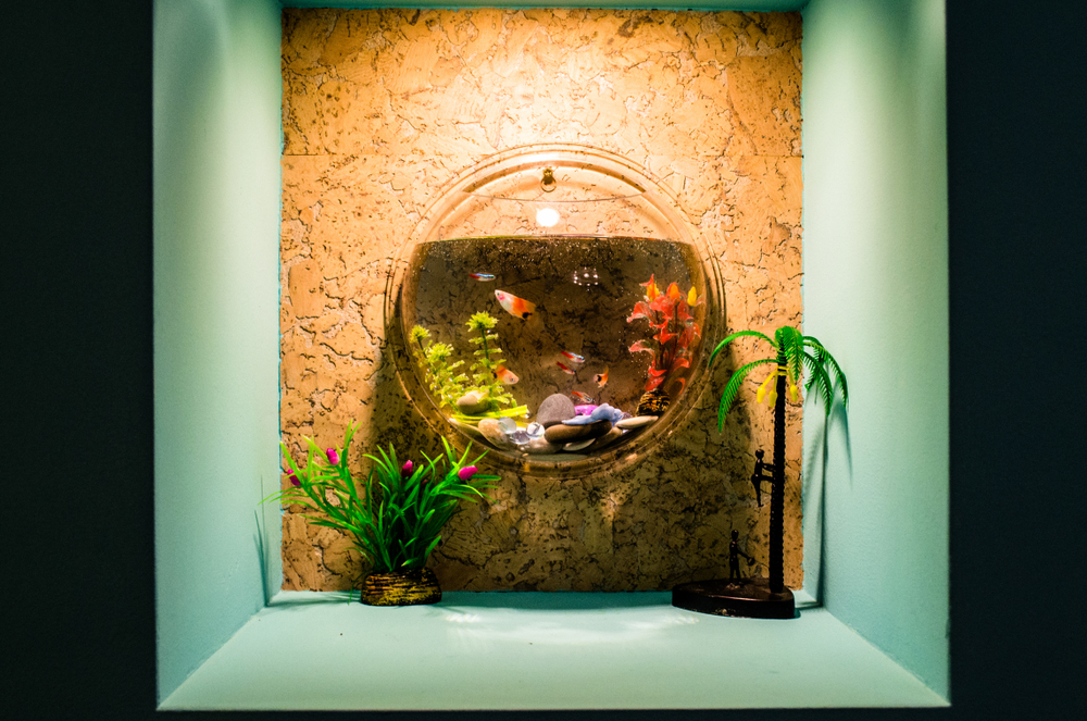 Установка аквариума в стену позволяет полностью раскрыть его красоту и внести в дизайн комнаты оригинальность.