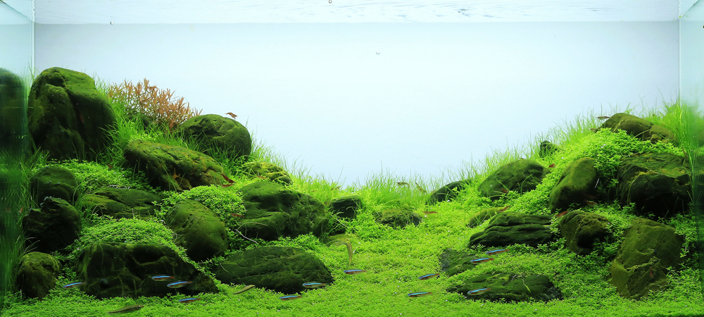 Если аквариум предназначены в большей степени для красоты, можно оформить его в японском стиле ивагуми, создав сад из нечётного числа стоящих или лежащих на дне камней разного размера.