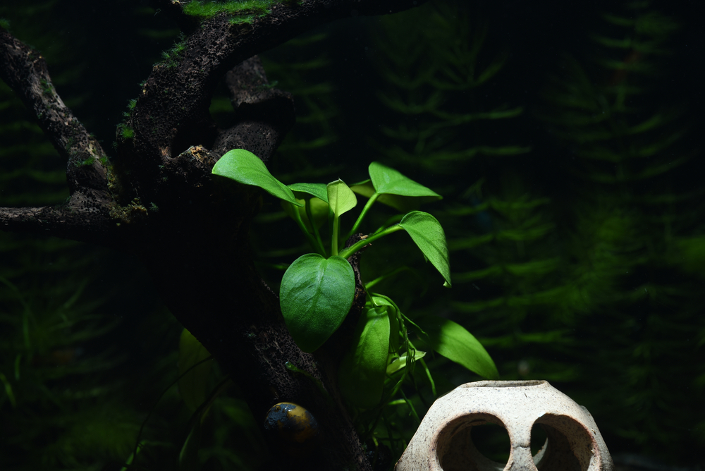 По моему глубокому убеждению, второе место среди самых нетребовательных растений, хорошо растущих у новичков, занимает карликовый анубиас. Он предпочитает умеренное освещение, почти равнодушен к значениям pH и gH, а его плотные листья не повреждаются рыбами и улитками. Анубиас можно прирастить к коряге, получается очень красиво. Недостатком его является медленный рост, из-за которого он не может активно влиять на аквариумную гидрохимию.