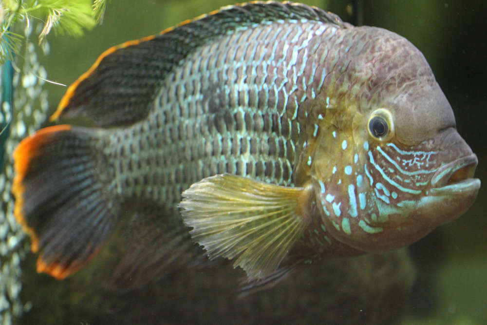 Рыбка отличается массивным телом и интересным окрасом – чешуя имеет голубовато-зеленую окантовку, а на жаберных крышках есть интересный бирюзовый узор. Фоновая окраска – серебристо-оливковая, а прямо посередине корпуса можно заметить темное неровное пятно. Спинной и хвостовой плавники отличаются оранжевой окантовкой, приятно контрастирующей с основным фоном туловища.