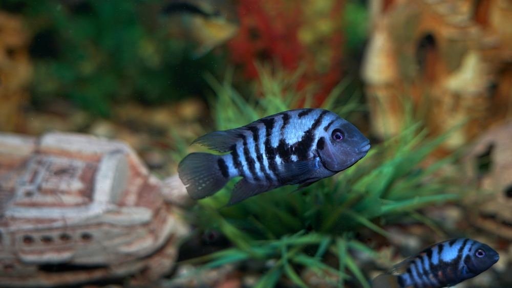Чернополосая цихлазома – территориальная рыба. Во время нереста становится агрессивной, активно защищает свое место и молодняк. Именно поэтому лучше держать их в видовом аквариуме или с другими цихлидами средних размеров, если объем аквариума и количество укромных мест позволяют.