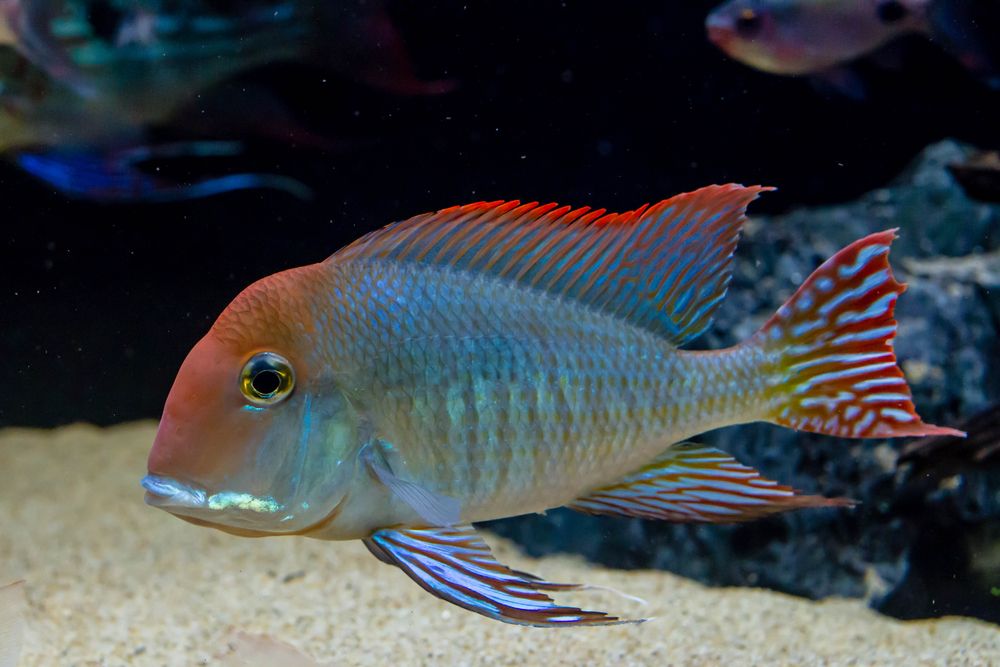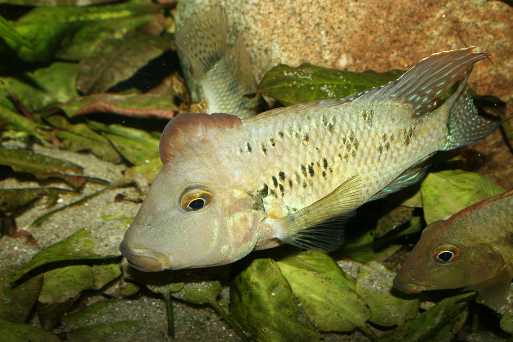В период нереста она увеличивается в размерах и становится ярче. Неудивительно, что второе название таких землеедов – краснолобый. Самки такого украшения не имеют. Кроме этого, они меньше и тусклее.