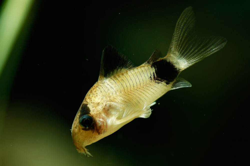 Панда (лат. Corydoras panda). Родина – река Укаяли в Перу. Тело его окрашено в белый, иногда с розоватым отливом цвет. Глаза, спинной плавник и основание хвоста украшены крупными черными пятнами. Эти рыбки не бывают более 3-4 см. Особенно на их рост влияет наличие или отсутствие живого корма. Условия для панды создать несложно: чистая, чуть подкисленная вода с температурой 22 градуса и регулярная аэрация – вот все, что ему нужно.