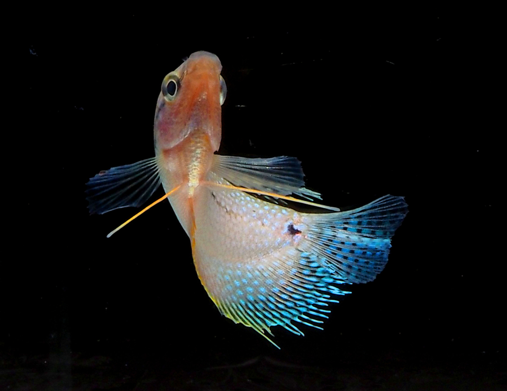 - Голубая. Тело макропода полностью неоново-голубого цвета. Иногда могут быть небольшие оранжевые или красные вкрапления.