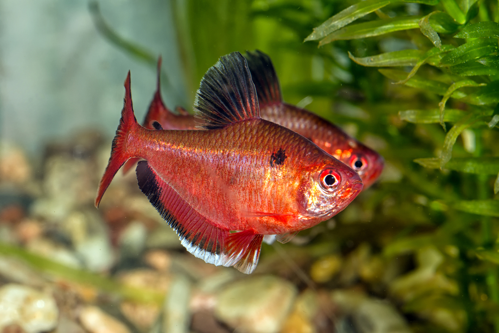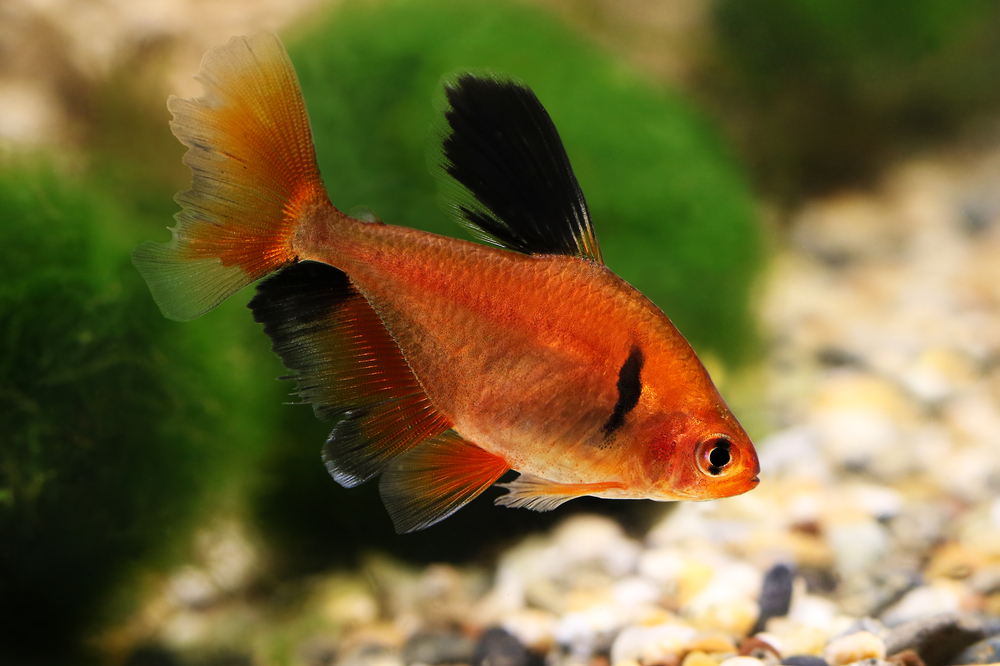 Плавник на спине черный, может иметь белую каемку или только кончик, а остальные (кроме жирового, который прозрачный) однотонные, насыщенно-красные. Хвост сильно вырезанный, у его основания на теле нет чешуек.