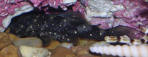 Окрасом напоминает звездчатого анцистра: по темному телу разбросаны мелкие светлые точки и напыление на пару тонов светлее фона. Размеры не превышают 12 см.