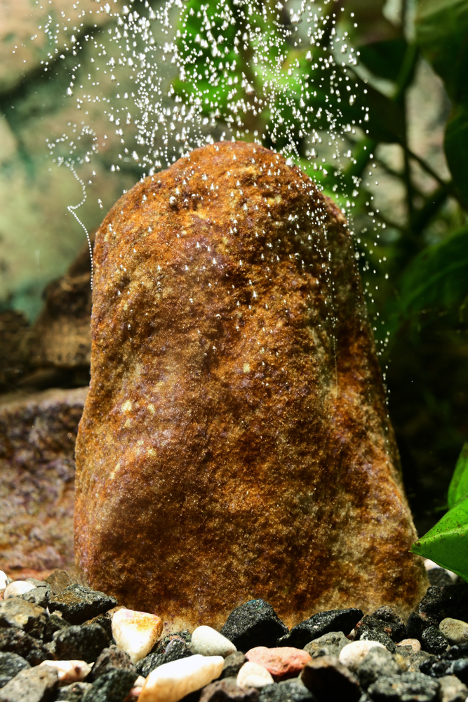 Есть и другой вариант. Например, очень эффектно в аквариуме смотрится натуральный камень, из которого выходит масса воздушных пузырьков. Для этого подойдут миотис пористый или пористый известняк. Но в этом случае возникают две проблемы. Во-первых, необходимо учитывать влияние камня на состояние жёсткости аквариумной водной среды. А во-вторых, следует обеспечить надёжное крепление края выходного воздушного шланга к камню. В принципе, специальный силикон поможет успешно решить данную проблему.