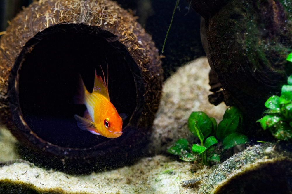 Элементы внутреннего декора — искусственные пещеры и гроты, коряги и обрезки труб — не нужно размещать выше среднего уровня, причём поставить их надо как можно дальше друг от друга (насколько позволяет площадь дна).