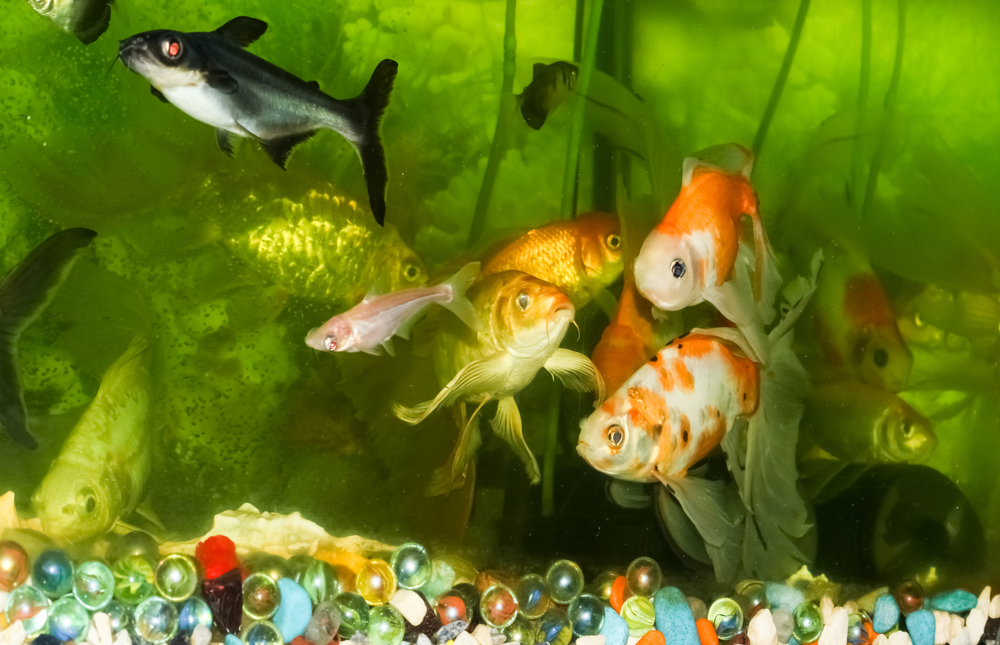 Размножение микроскопических зелёных эвгленовых водорослей приводит к окрашиванию водной среды в жёлто-зелёный или ярко-зеленый неестественный цвет. Их небольшое количество всегда имеется в любом аквариуме. Они попадают с кормом, и содержатся даже в прозрачной воде. А к позеленению приводит их активное размножение, вызванное неправильно организованным, чрезмерным освещением аквариума. Стараясь держать рыбок на виду, всё же нужно защищать их от попадания прямого солнечного света, а также от усиленного искусственного освещения. Зимой освещение следует включать не более чем на 10 часов, а в летний день — на 12 часов. Иначе водоросли могут покрыть и стенки, и предметы декора, отмыть их в дальнейшем будет не так-то просто.