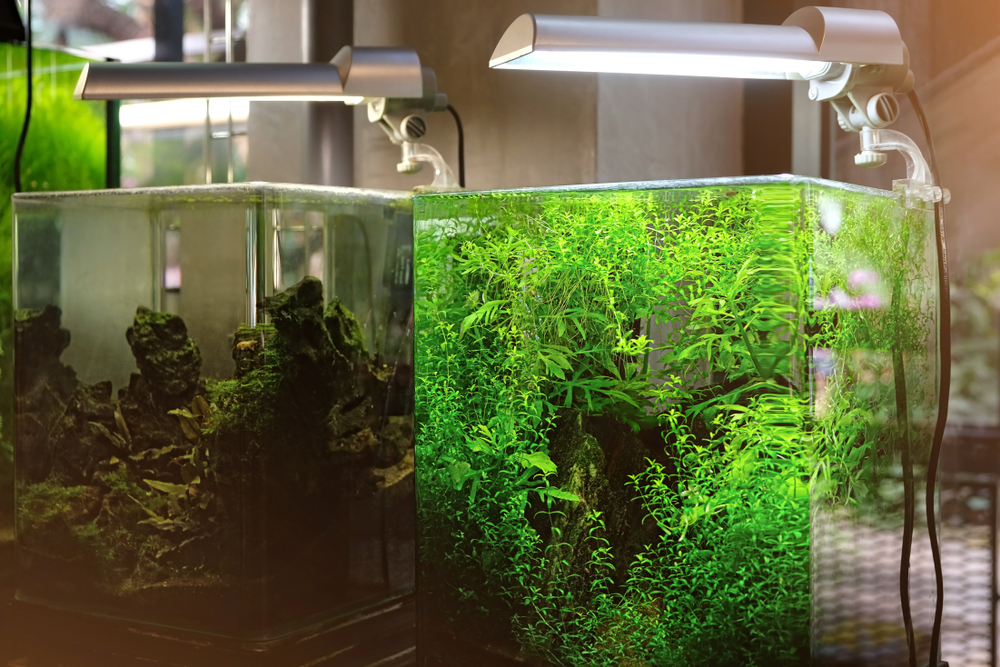 Из-за обязательного наличия живых растений актуальным становится вопрос освещения маленького аквариума. Там практически никогда не используются лампы, встроенные в крышку, светильники устанавливаются на некоторой высоте над аквариумом. Применяются обычно люминесцентные или светодиодные лампы. В целом правило такое: если лампы люминесцентные, то для неприхотливых растений свет должен быть 0,5 Вт на литр воды, для прихотливых почвопокровных или имеющих красноватый оттенок — 1 Вт на литр. Если лампы светодиодные, то соотношение мощности лампы и величины светового потока у них другое, и здесь уже смотрят на количество люменов. Для нетребовательных растений достаточно освещённости в 25 лм на литр, для требовательных — 50 лм.