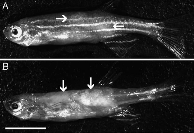 - Из-за поражения спинных мышц рыба страдает нарушенной координацией движения, иногда подвисает в наклонном положении вверх хвостом.
