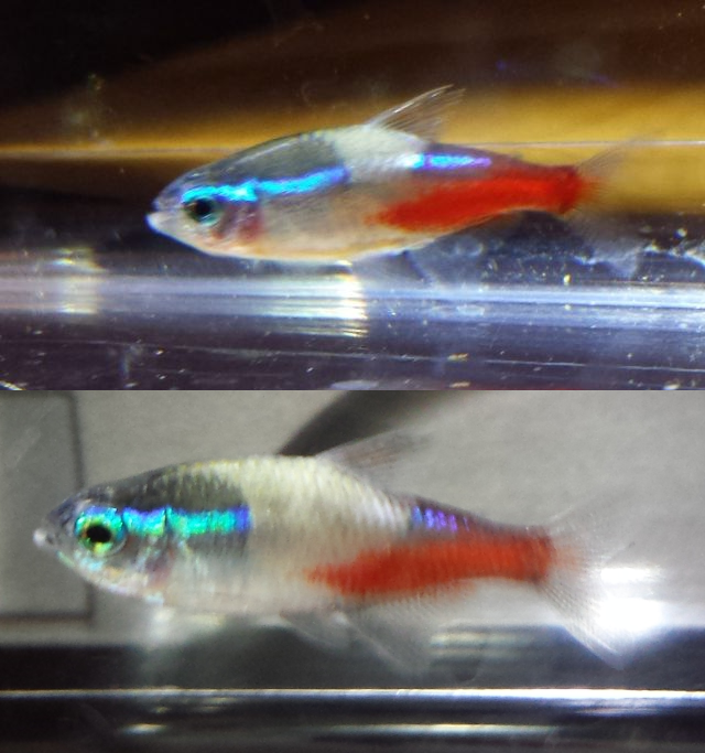 - Обширные белые участки на спине. Иногда они могут заходить на цветные полоски у неонов, которые в таком случае теряют окраску.