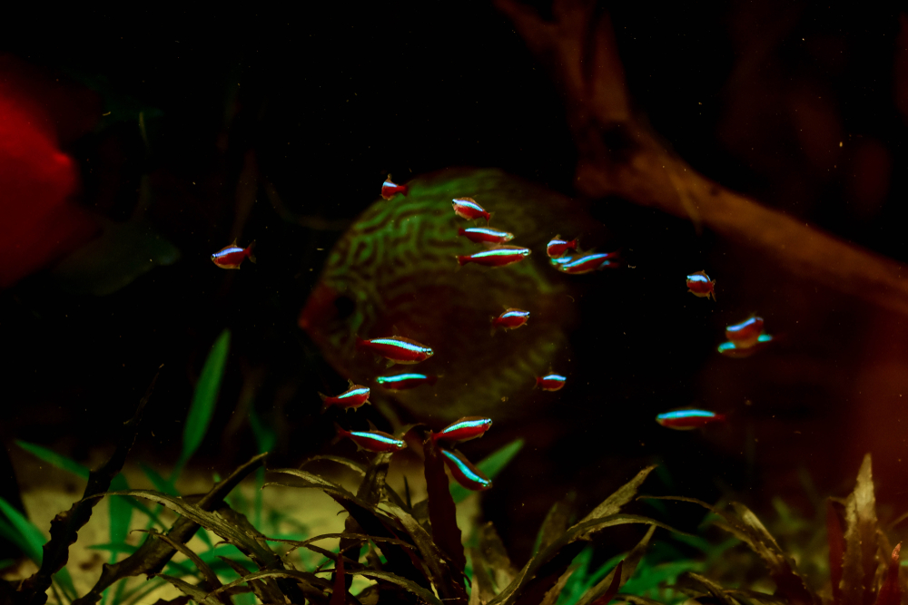 - Большие глаза, прекрасно видящие в темноте, делают неонов очень восприимчивыми к яркому свету, при котором они могут испытывать стресс, сопровождаемый спонтанными прыжками из аквариума. Постарайтесь создать для животных как можно больше затененных участков, а на поверхности разместить плавучие растения.