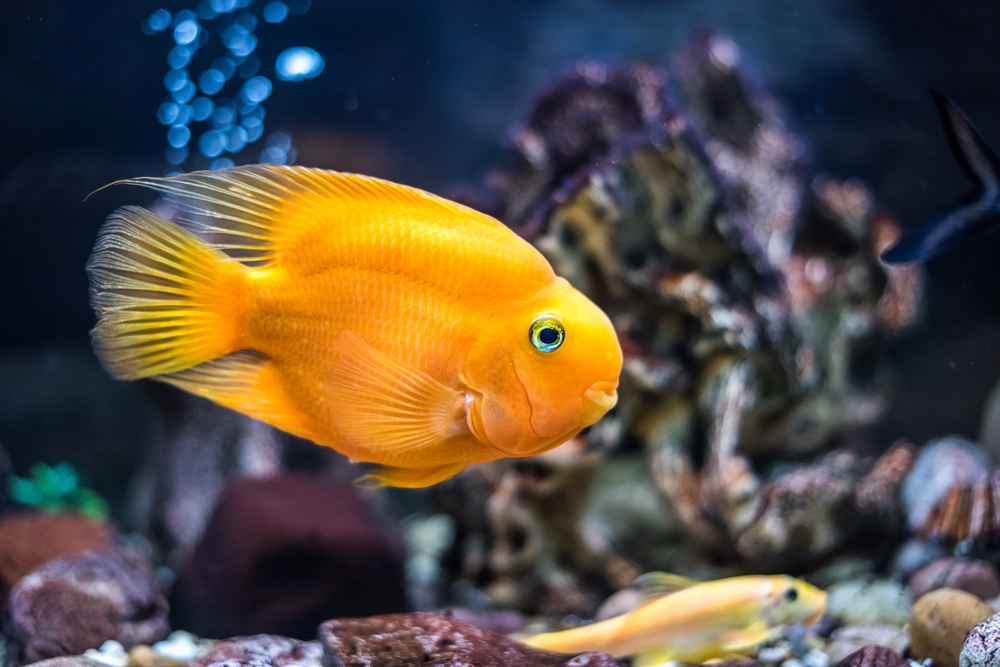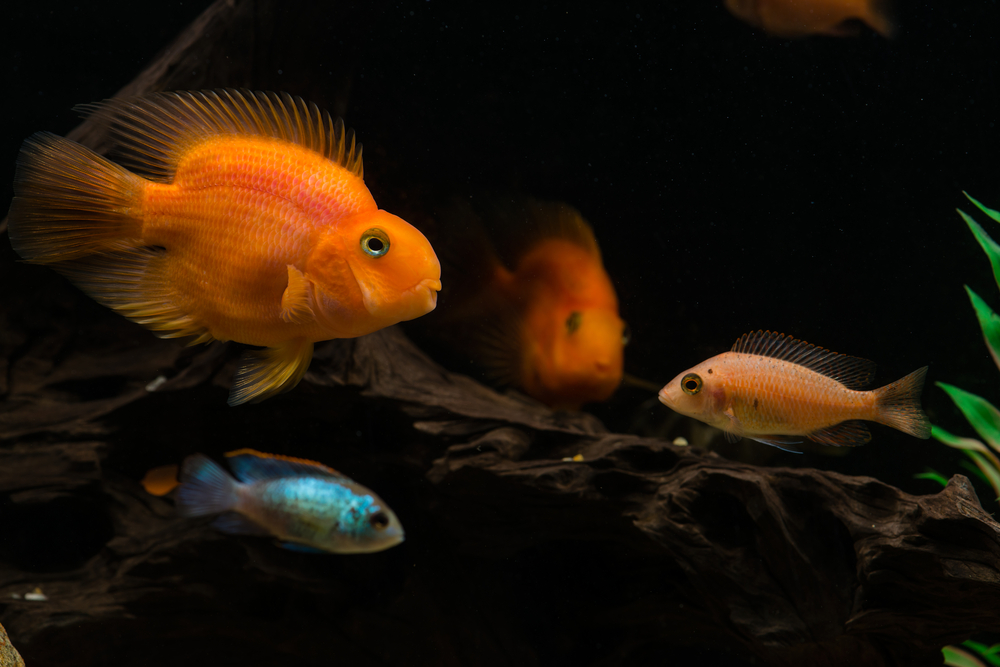 Делить аквариум попугаи могут с большинством рыб, главное, чтобы соседи были не слишком мелкими и не помещались у них во рту.