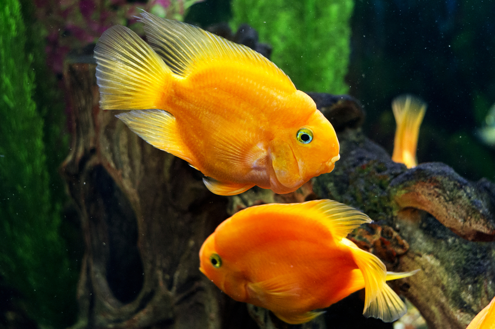 [su_note note_color=»#fcf8e3″ text_color=»#010101″ radius=»10″ class=»su_my_warning»]Попугаи — рыбы территориальные, с выстроенной иерархией внутри группы, поэтому в аквариуме необходимо соорудить большое количество укрытий. [/su_note]Это могут быть черепки, гроты и половинки кокосовой скорлупы, но лучше всего поместить в воду ближе к задней стенке аквариума несколько длинных извилистых коряг и переплести их друг с другом в виде некоего лабиринта, создав, таким образом, целую систему проходов и пещерок, где можно спрятаться.