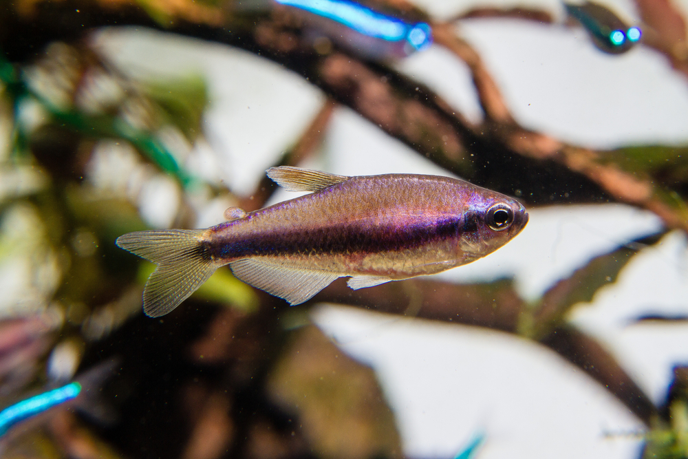 - сиреневый неон гораздо мельче императорской тетры;
