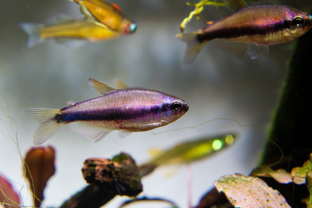 - Как и прочие представители семейства харациновых, сиреневые неоны – стайные рыбки, поэтому содержать их необходимо в коллективе. Оптимальной будет группа от 10 хвостиков, для которой понадобится аквариум от 30 литров.