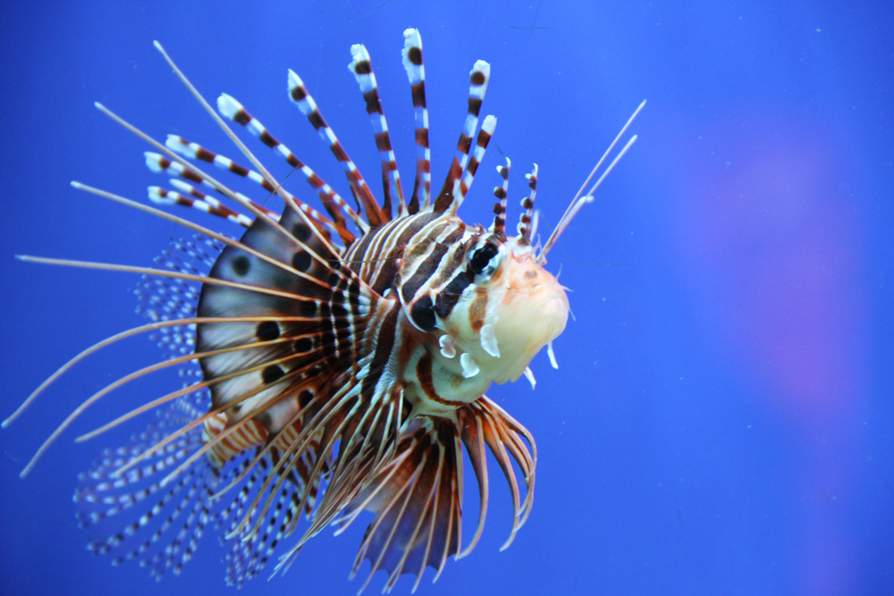 Львиная скорпена обладает интересной окраской и поведением. Ее плавники пышные, длинные, а их жесткие лучи преобразованы в толстые ядовитые шипы. Окраска может варьироваться от полосато-оранжевой до серой. В аквариуме ее грация способна надолго привлечь внимание.