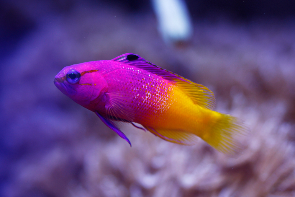 Окрас королевской граммы яркий и привлекает в себе внимание — передняя часть окрашена в насыщенный малиновый цвет, который плавно переходит в канареечно-желтый хвост.