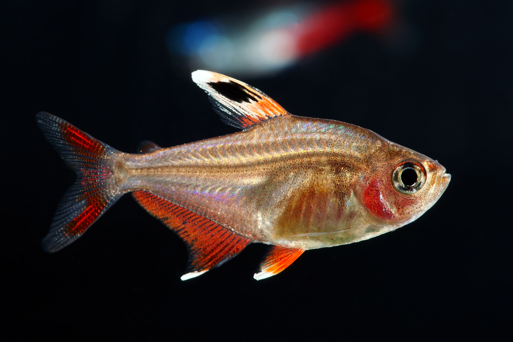 Одна из самых необычных и красивых тетр. Ее тело полупрозрачное, и через него отчетливо виден позвоночник рыбки. Хвостовой плавник, начиная от стебля, имеет насыщенный кроваво-красный цвет.