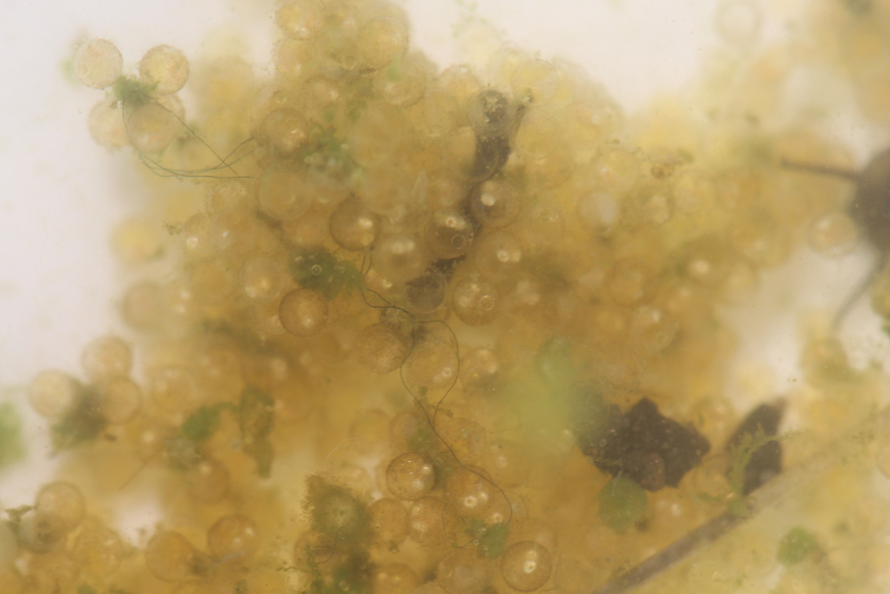 У созревших икринок можно заметить серебряный ирис глаз личинок.